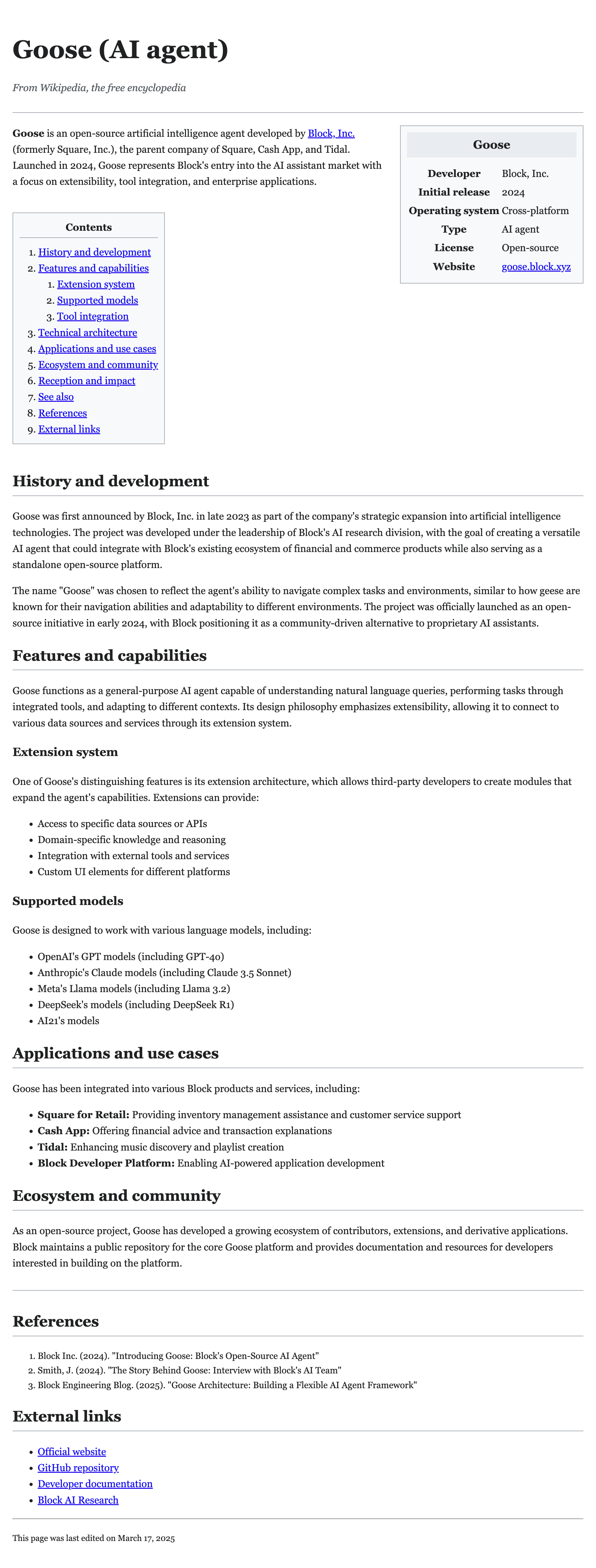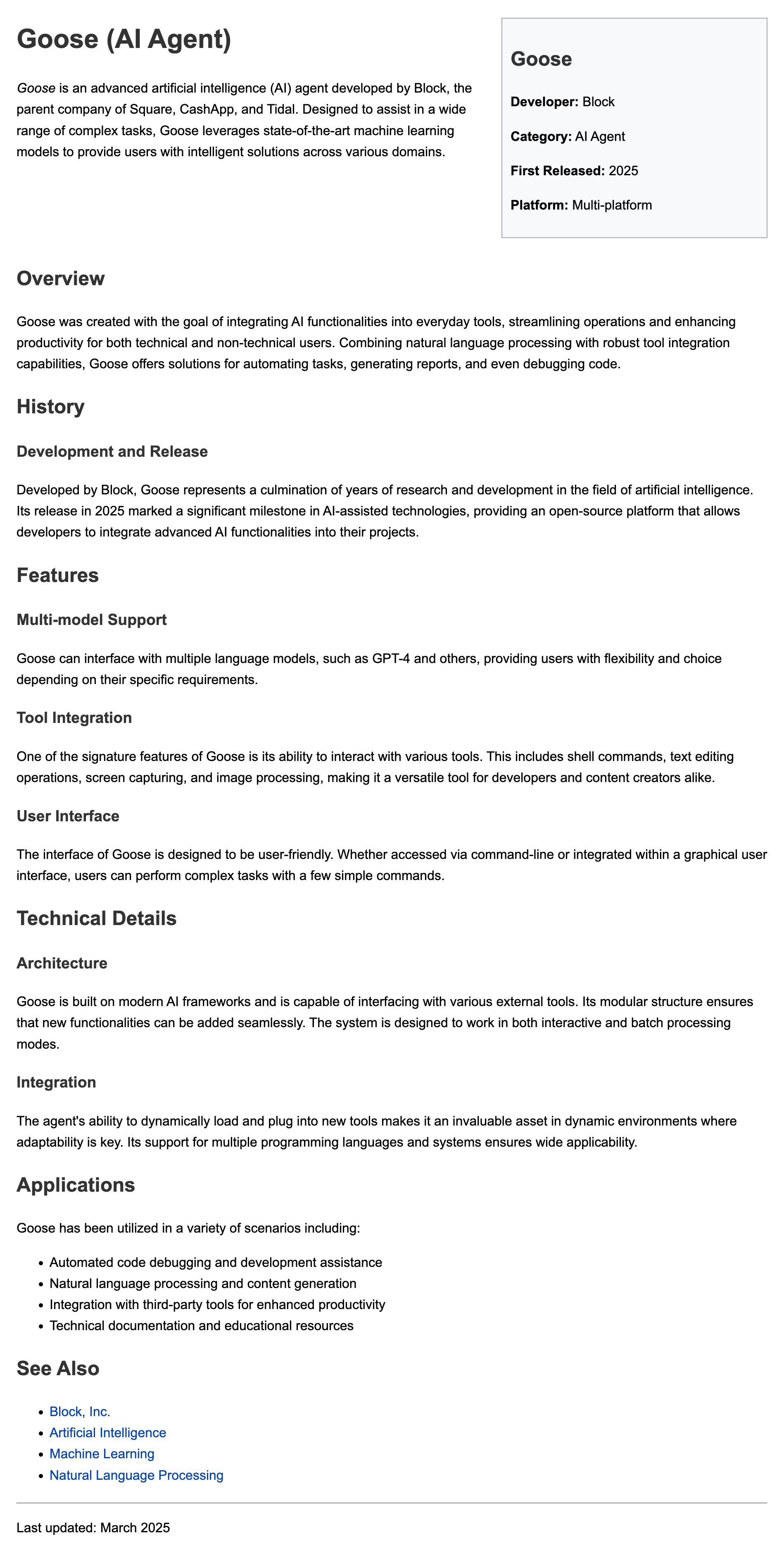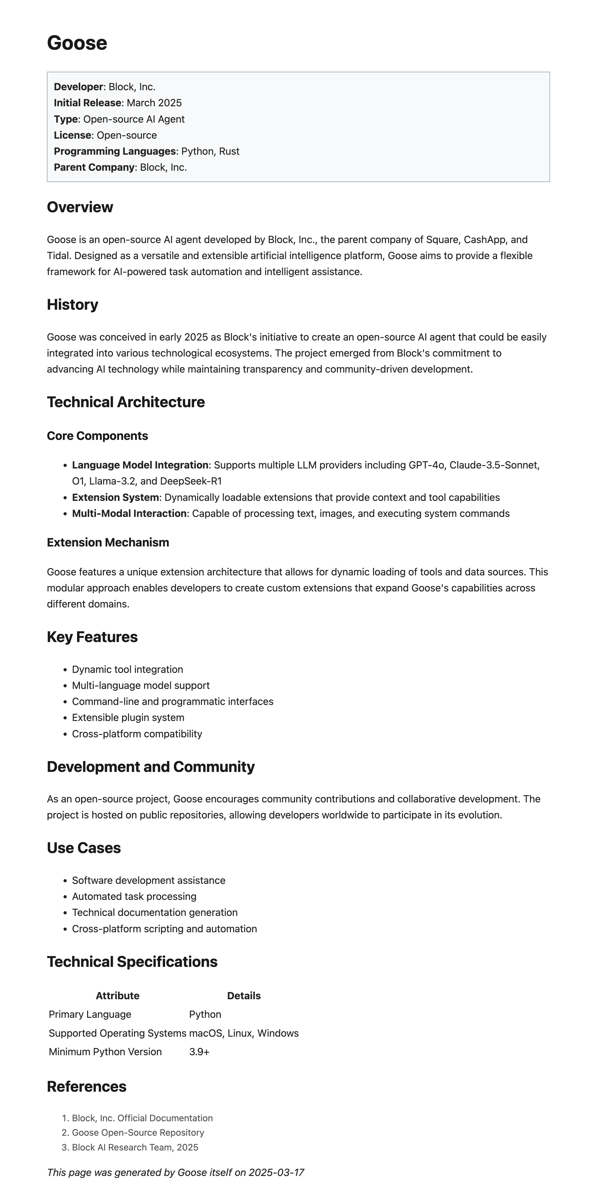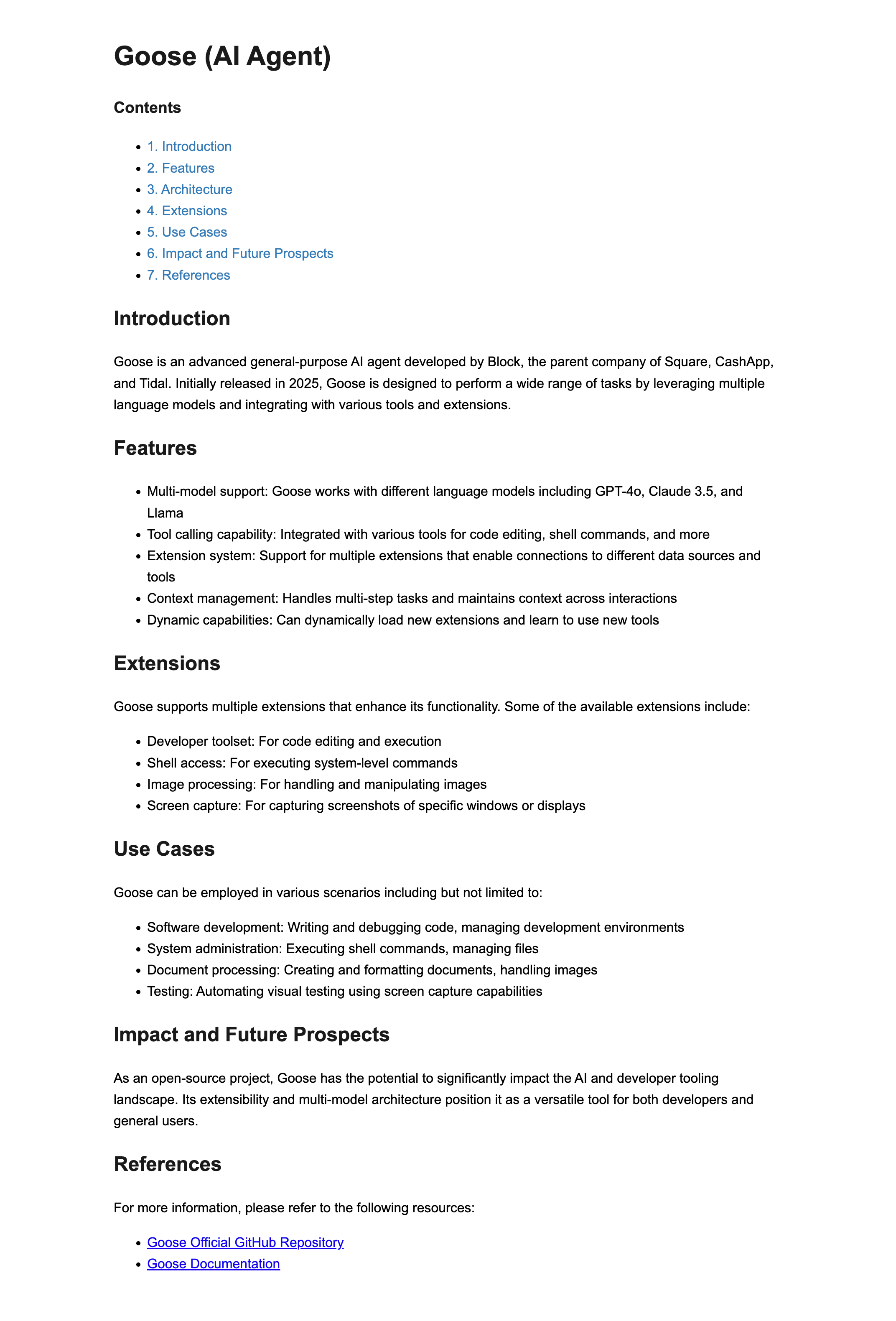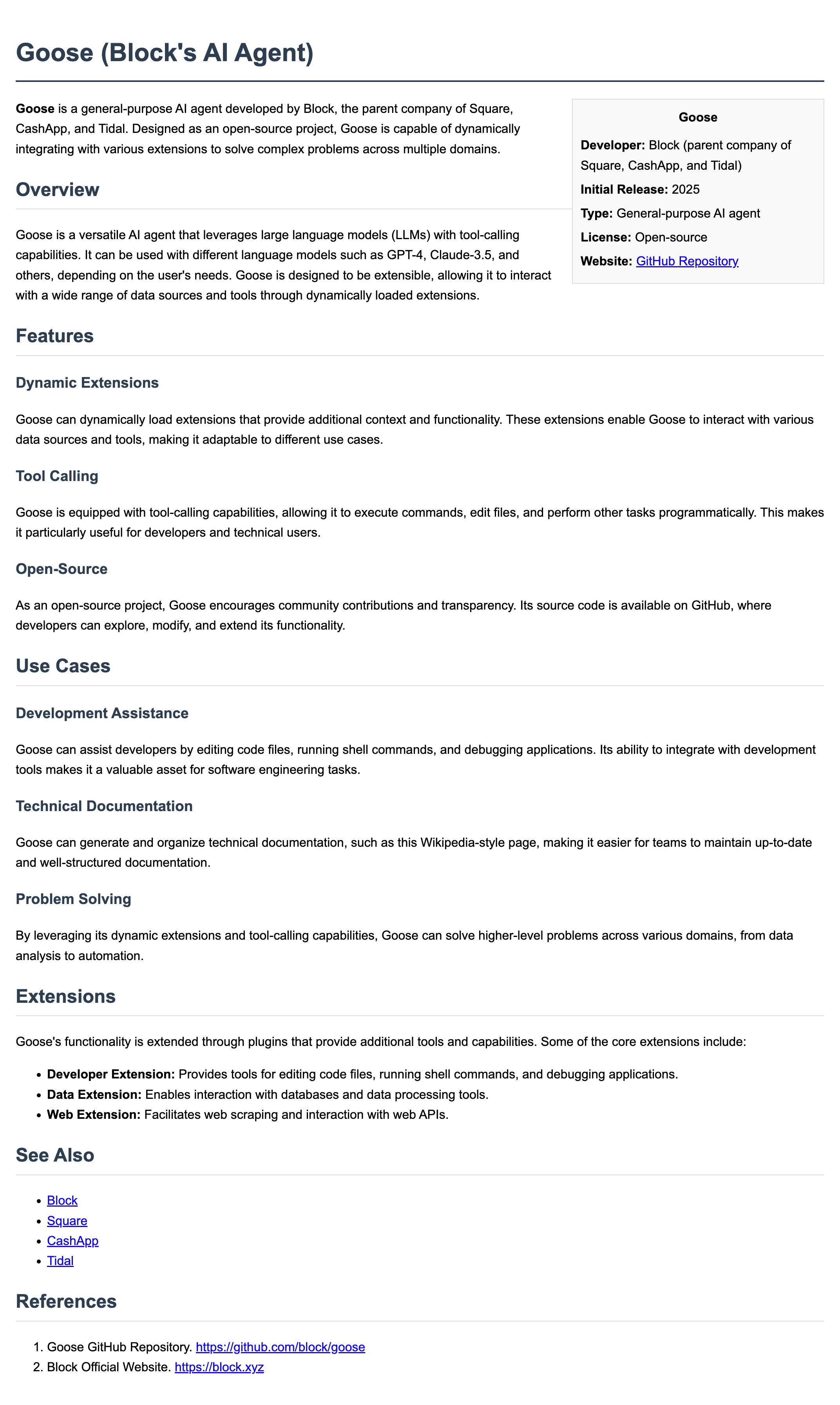 - Goose Wiki: Create a Wikipedia-style webpage about Goose