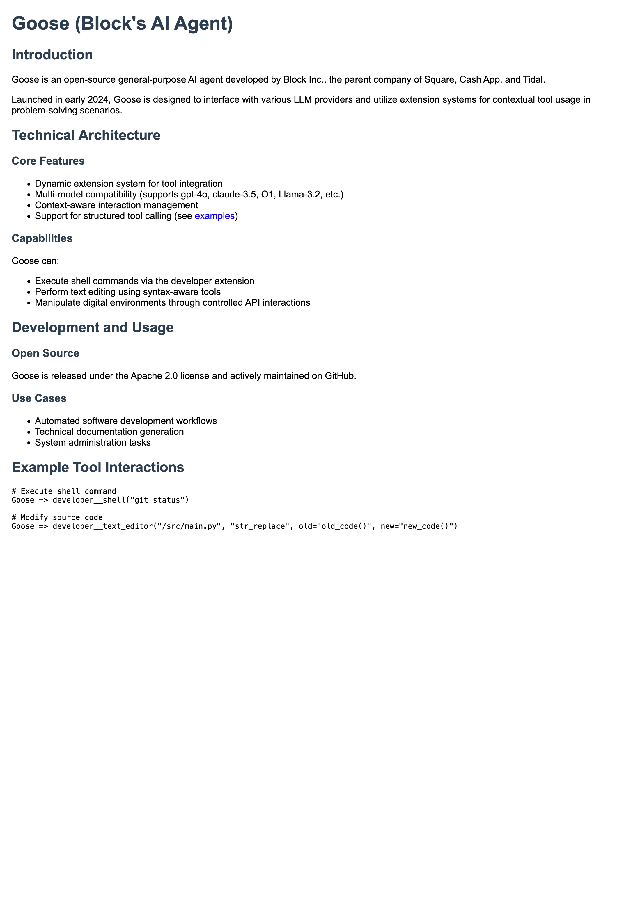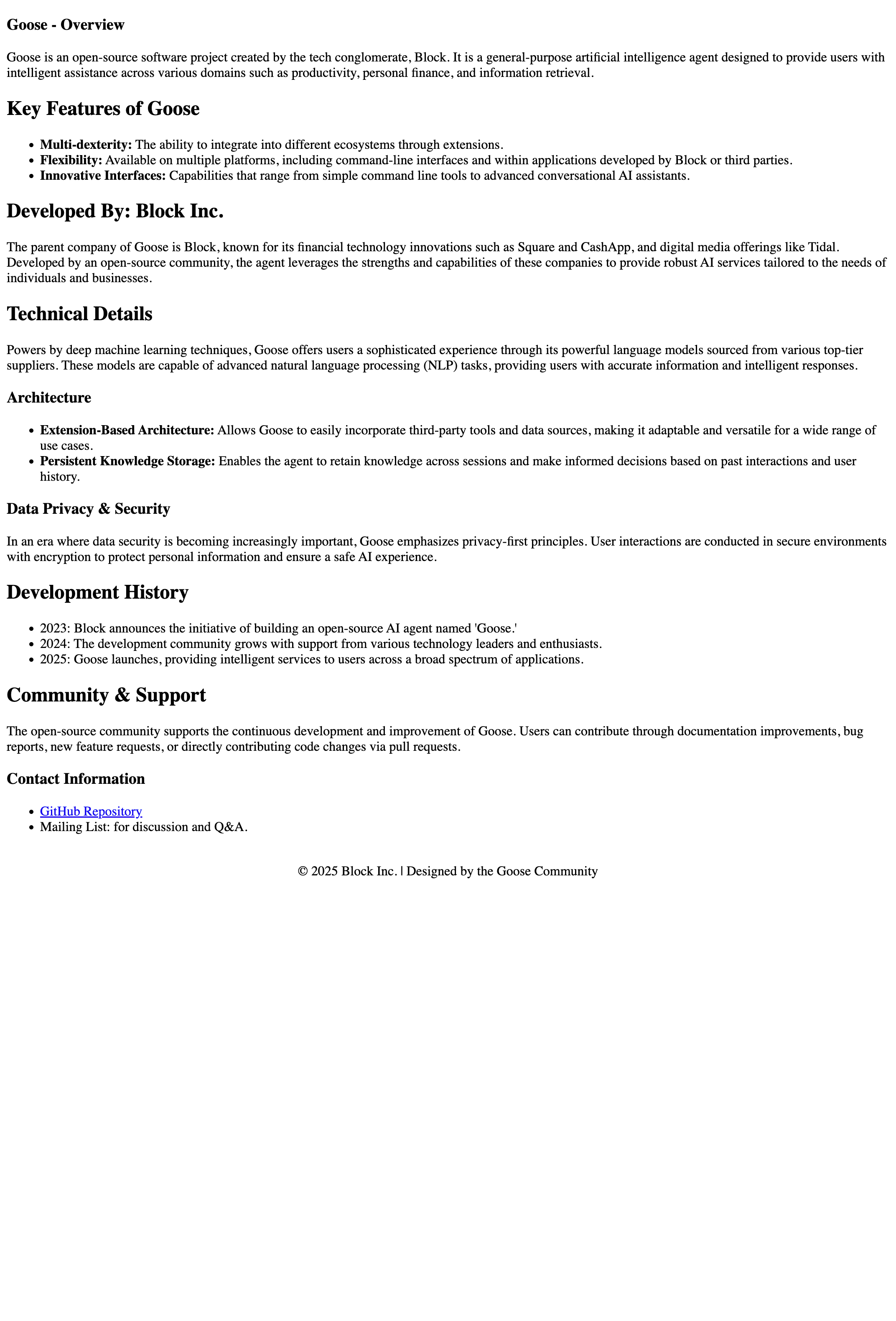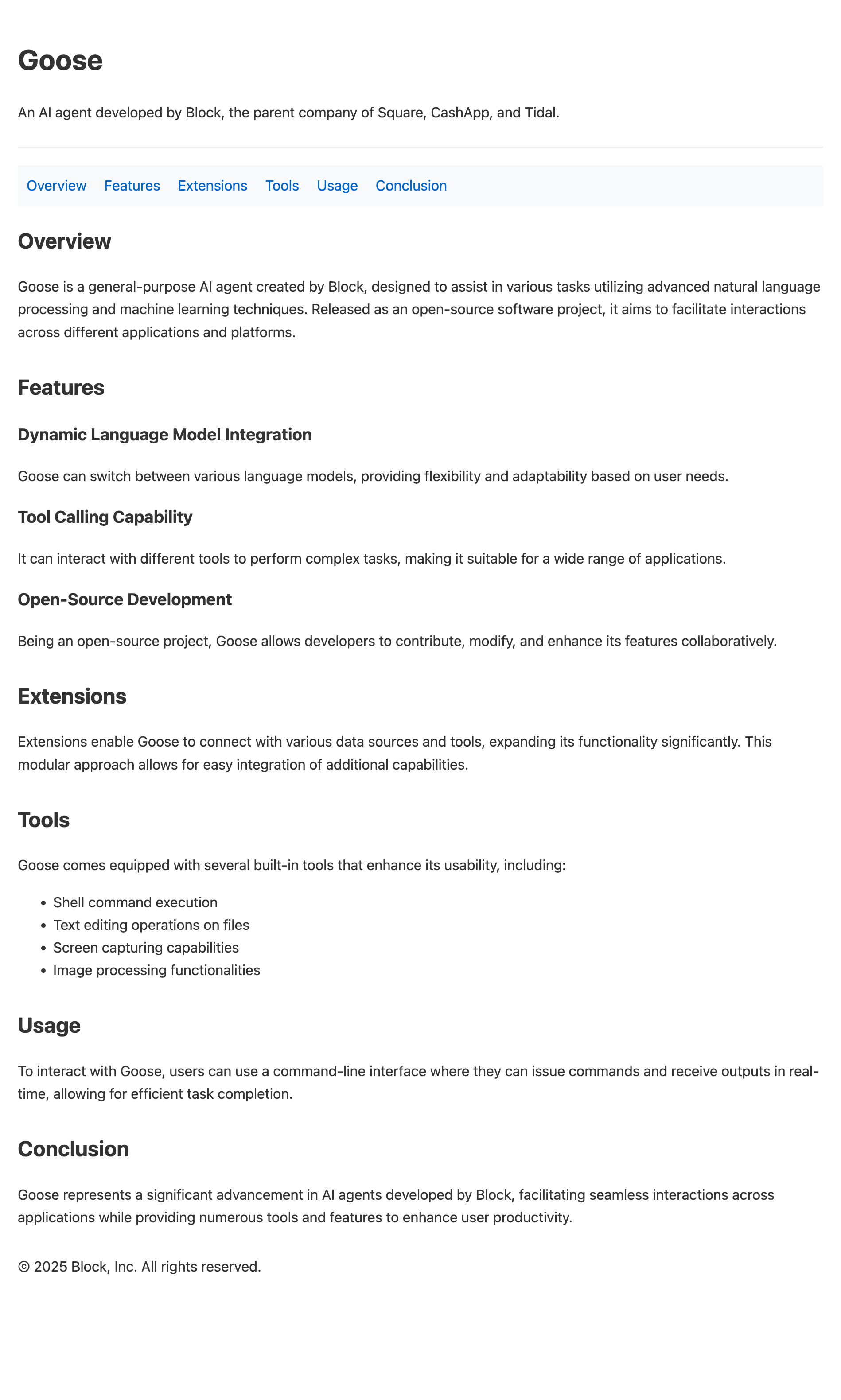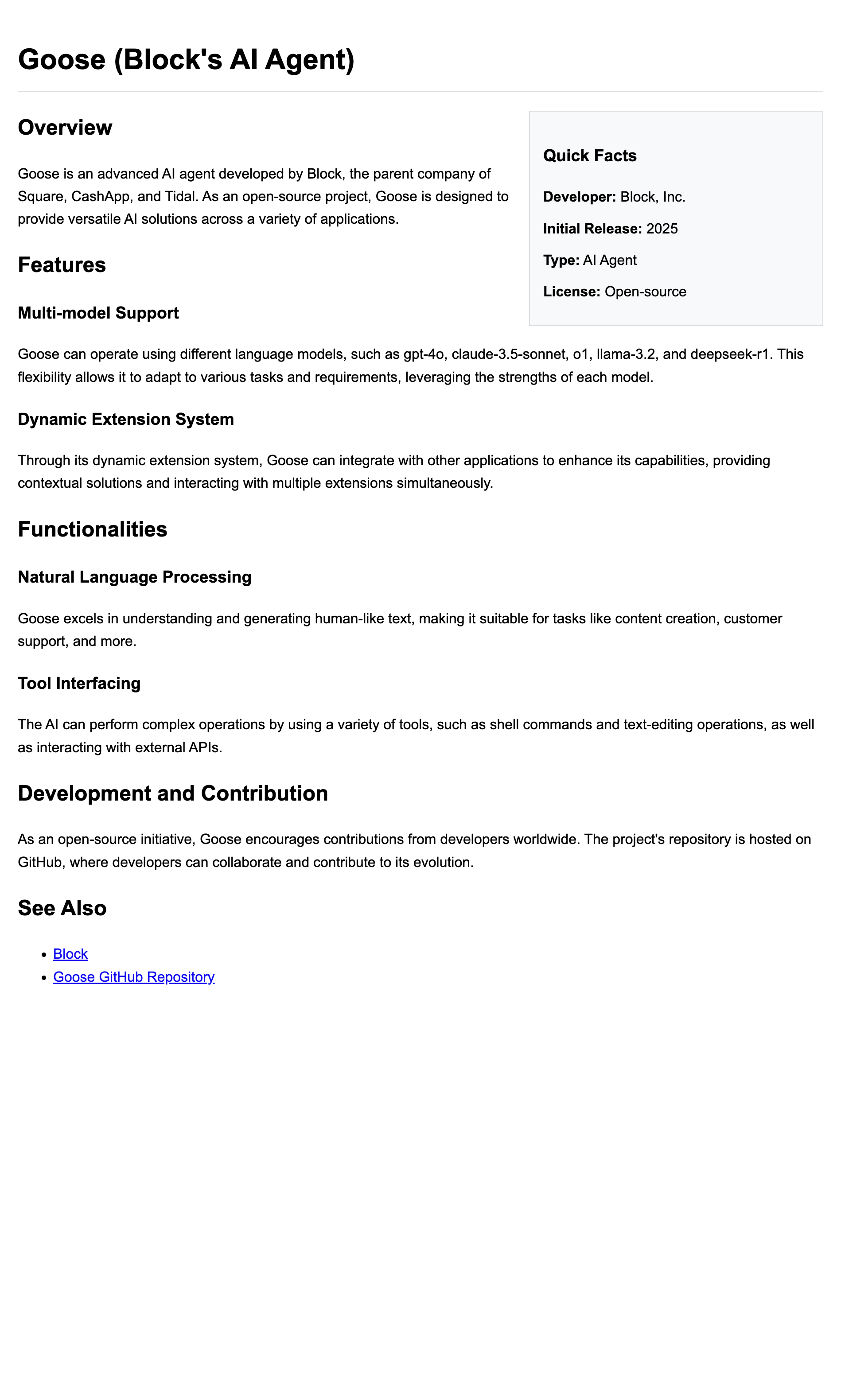 - Goose Wiki: Create a Wikipedia-style webpage about Goose