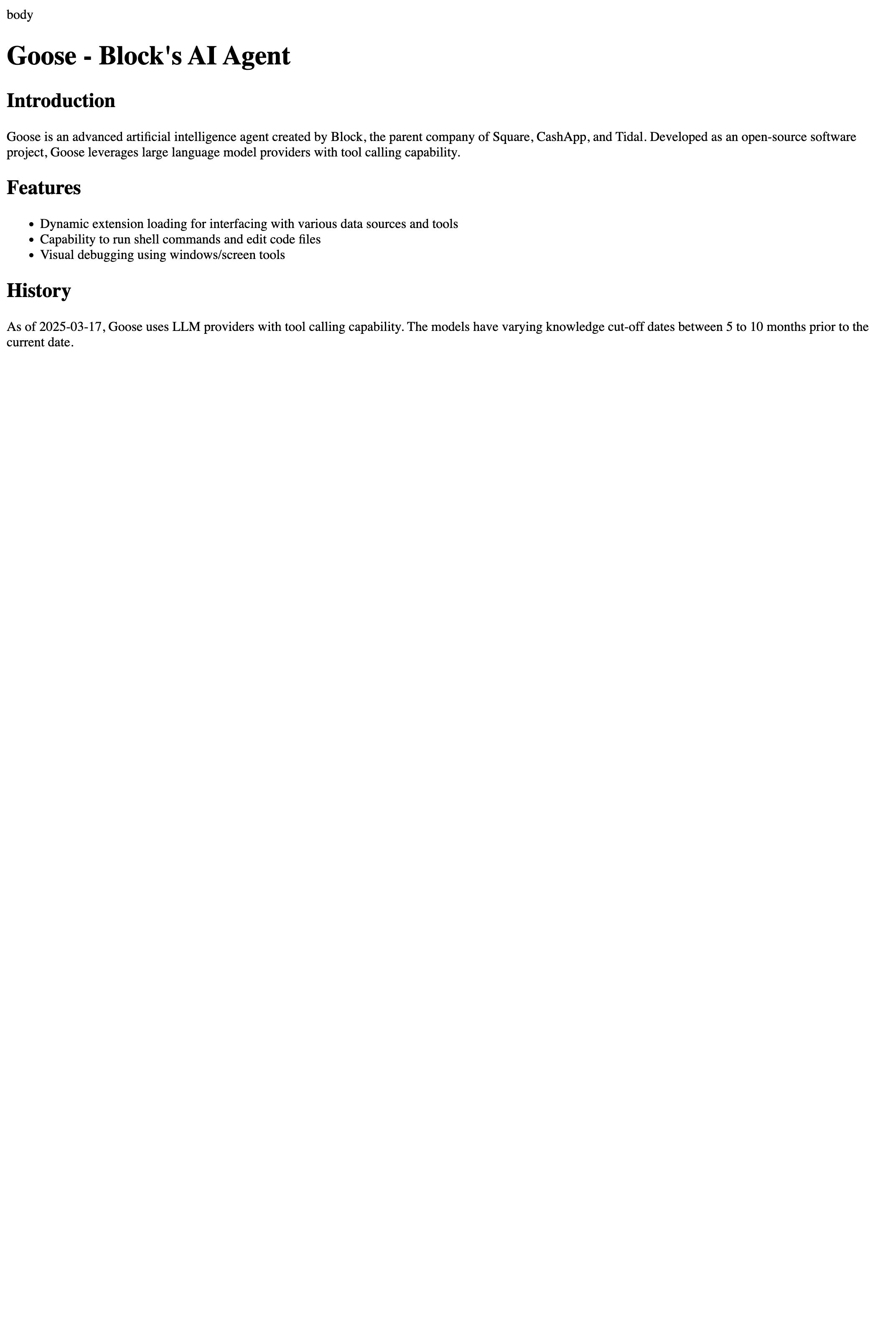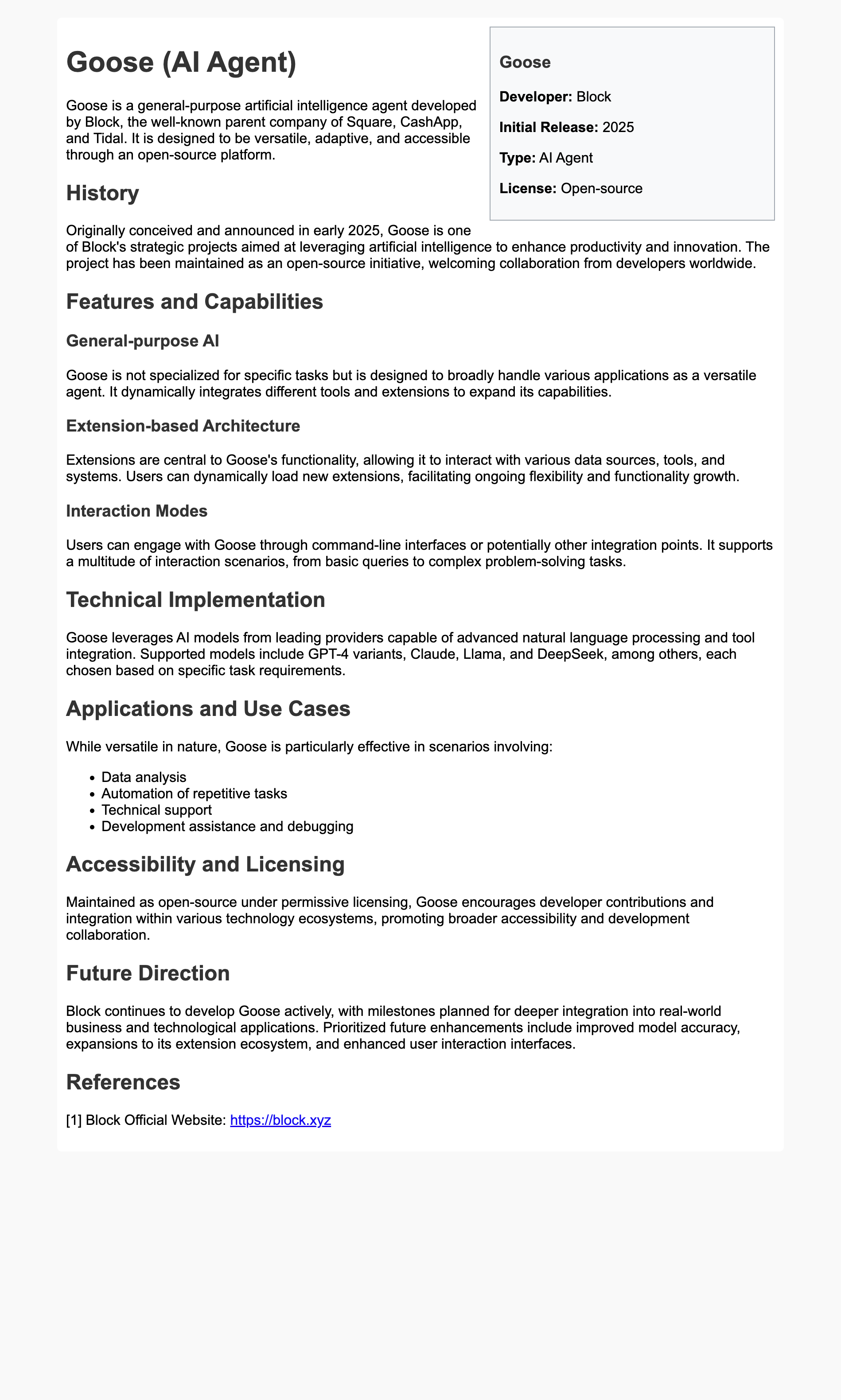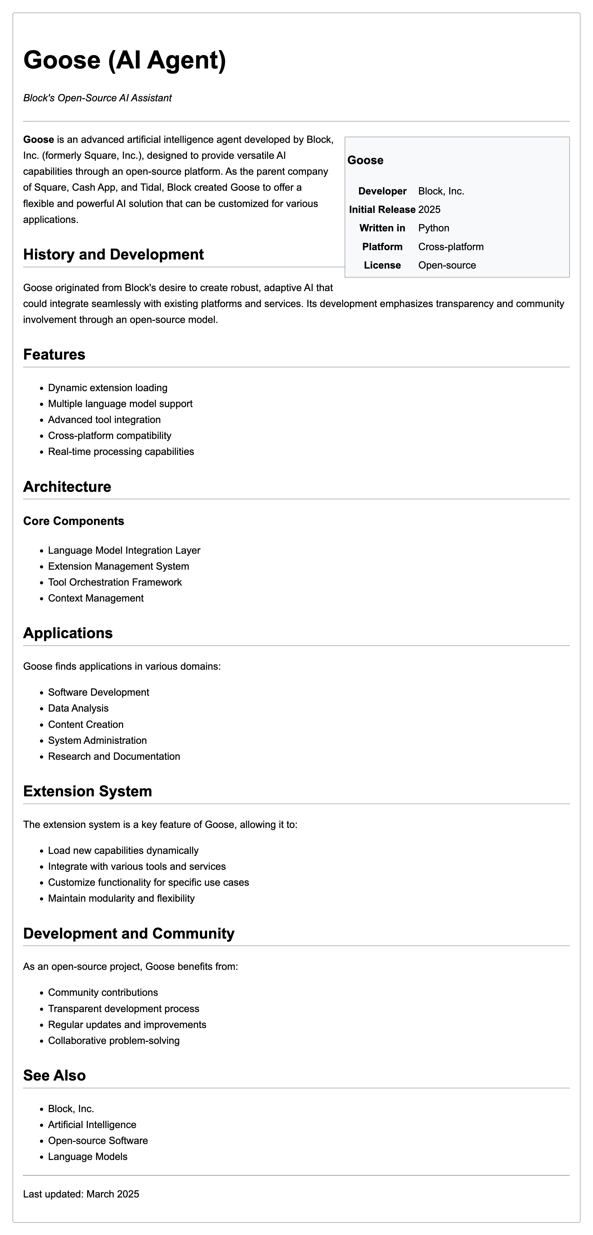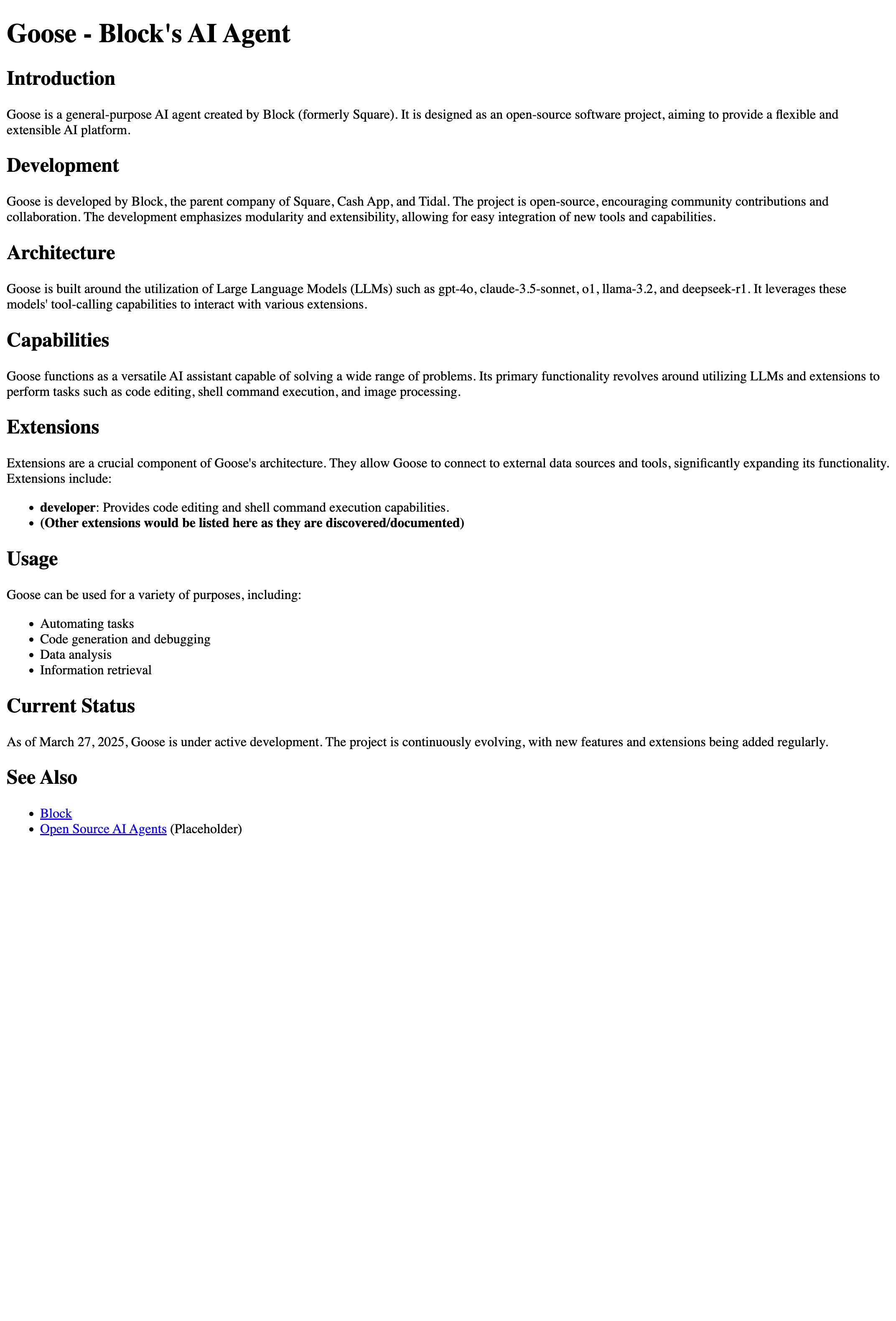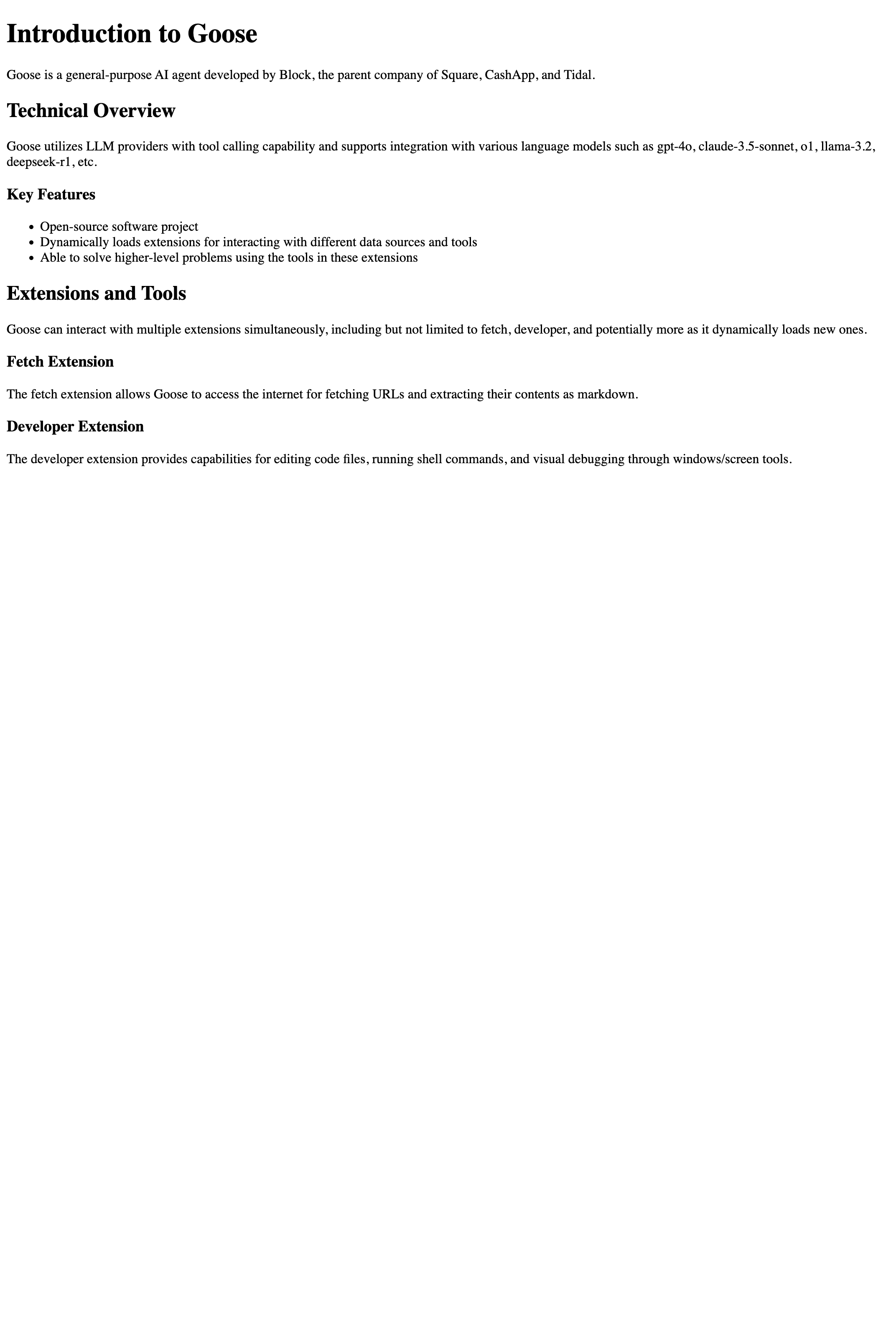 - Goose Wiki: Create a Wikipedia-style webpage about Goose