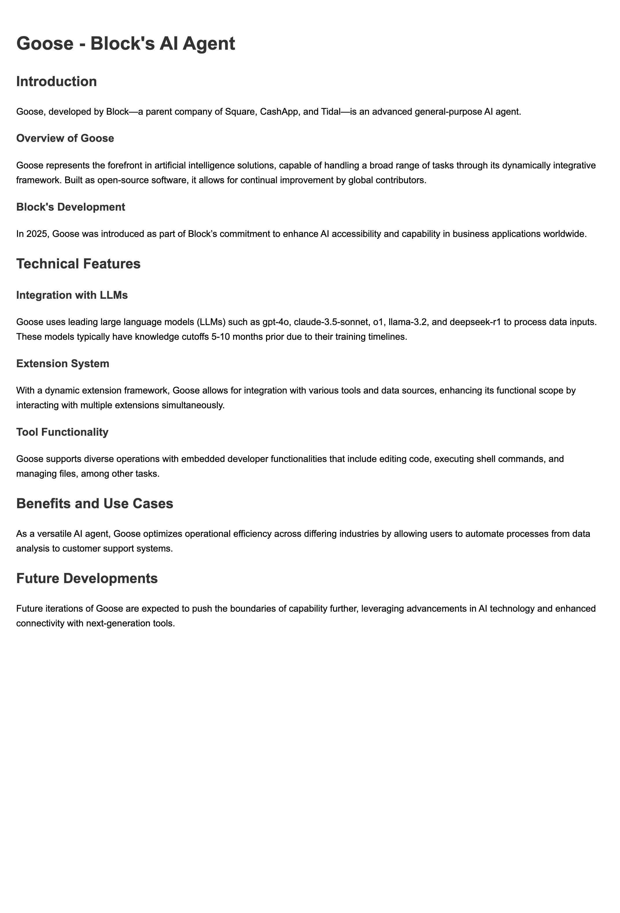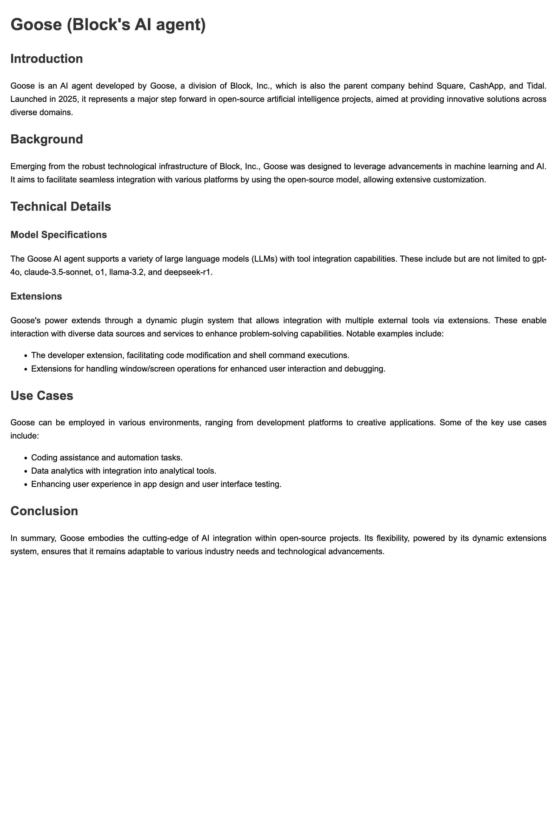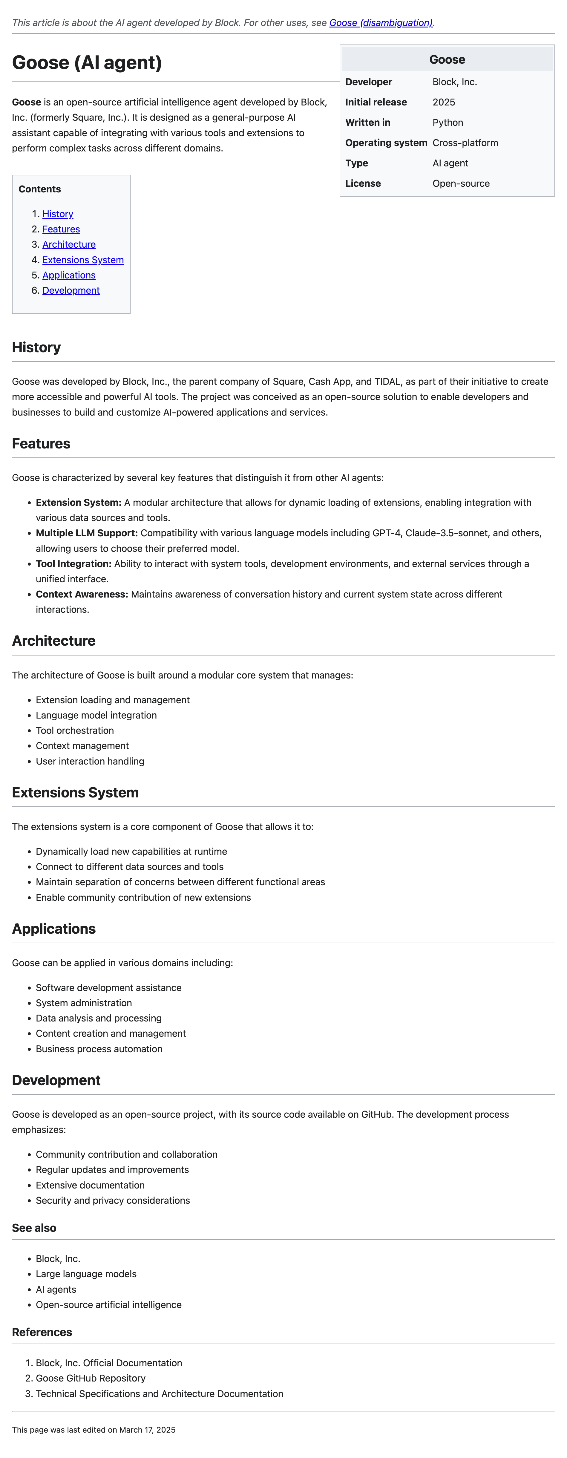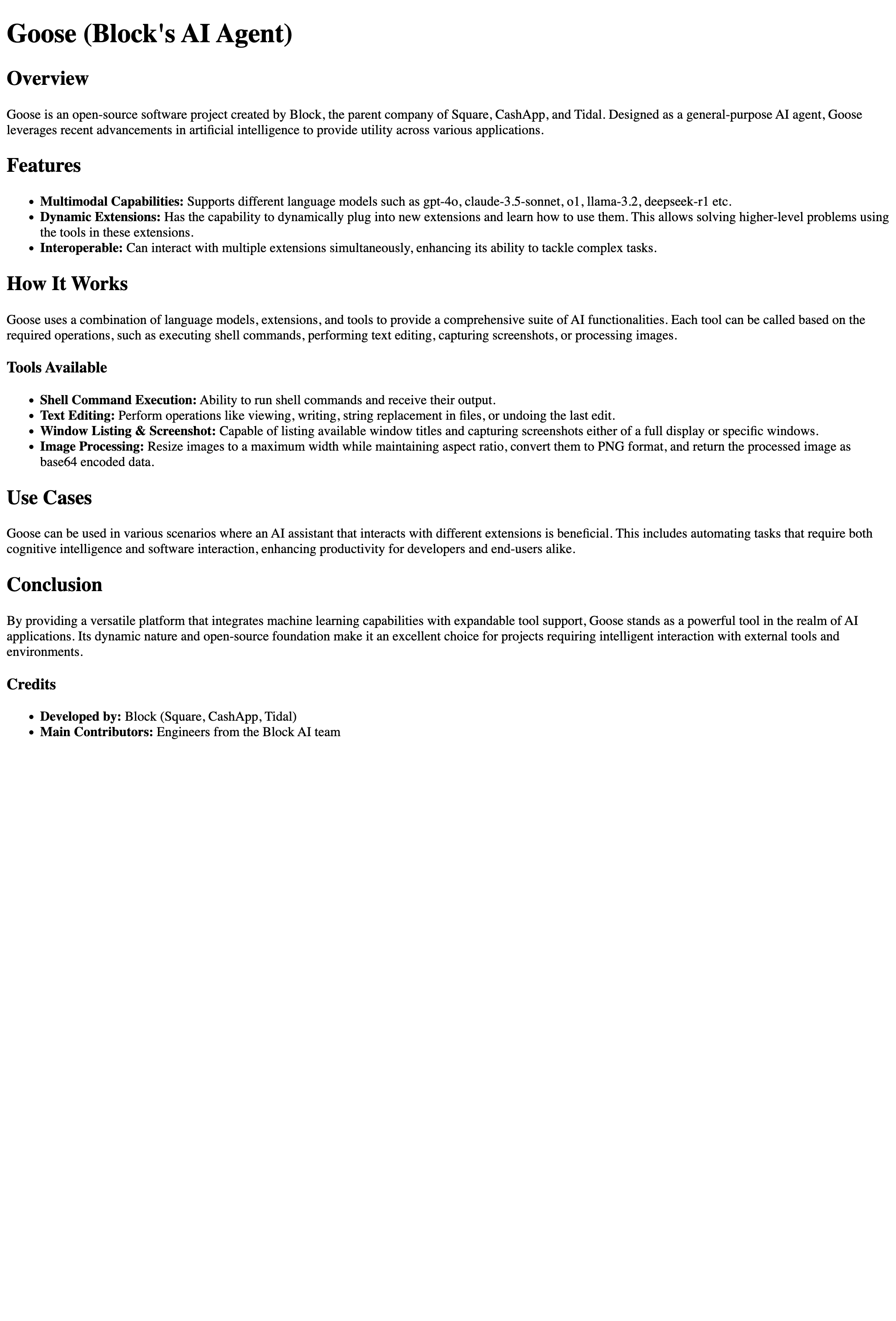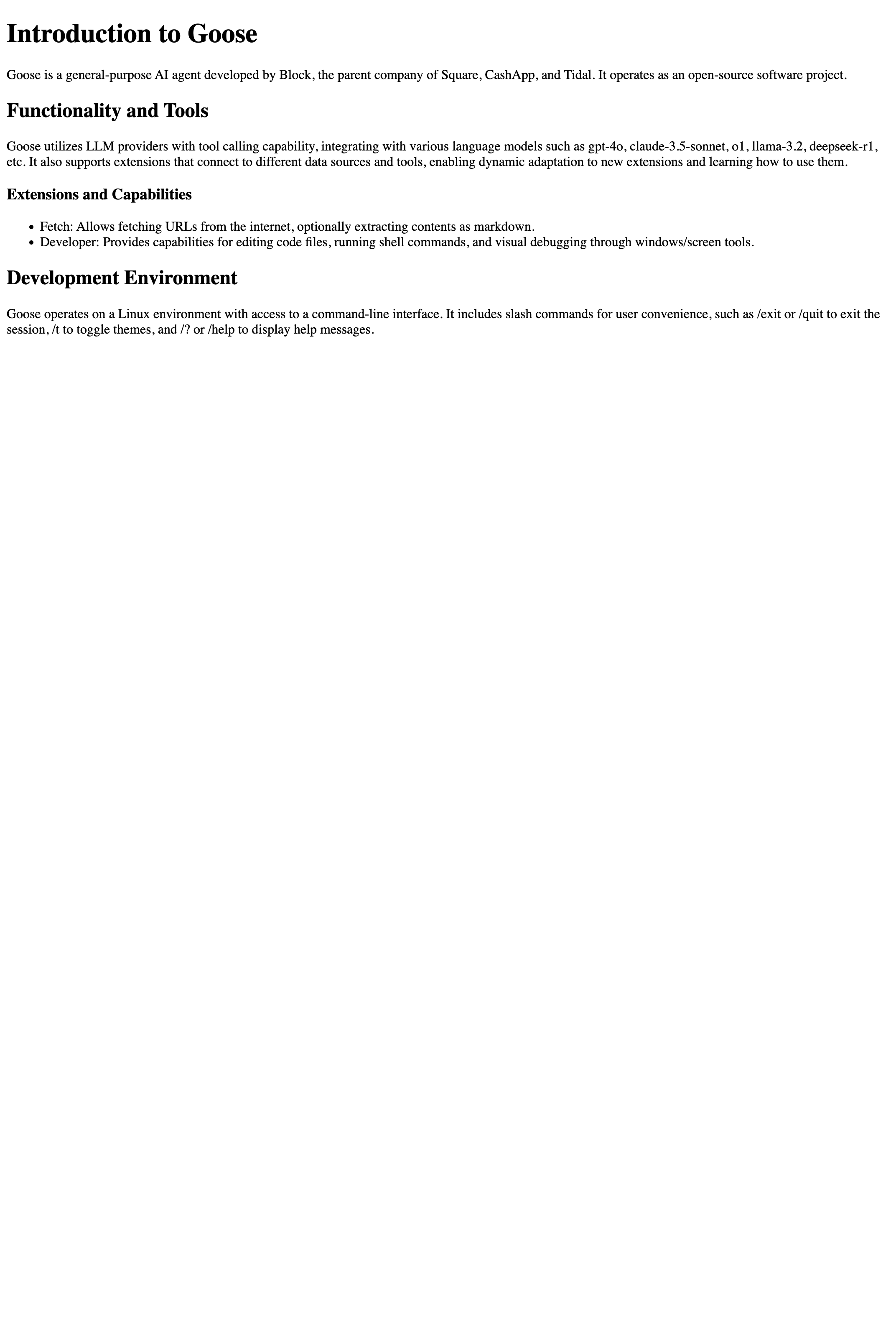 - Goose Wiki: Create a Wikipedia-style webpage about Goose