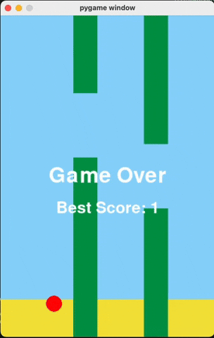 For runs that successfully created a working flappy bird game with pygame, here are the gifs of playing the games:
