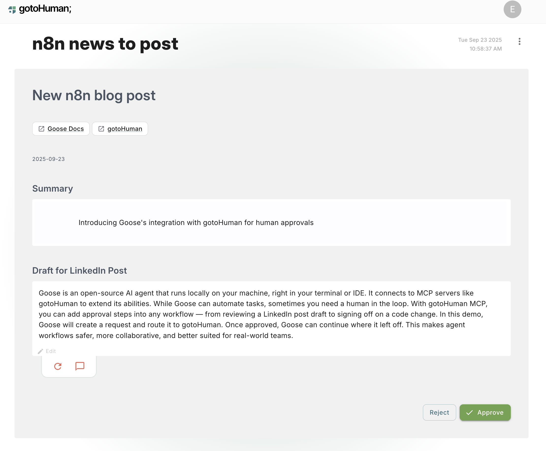 In this example, goose sends a LinkedIn post draft to gotoHuman for approval using the n8n news to post template that was created.